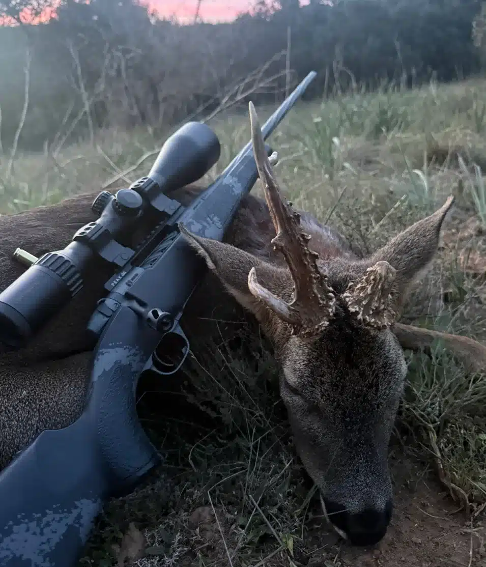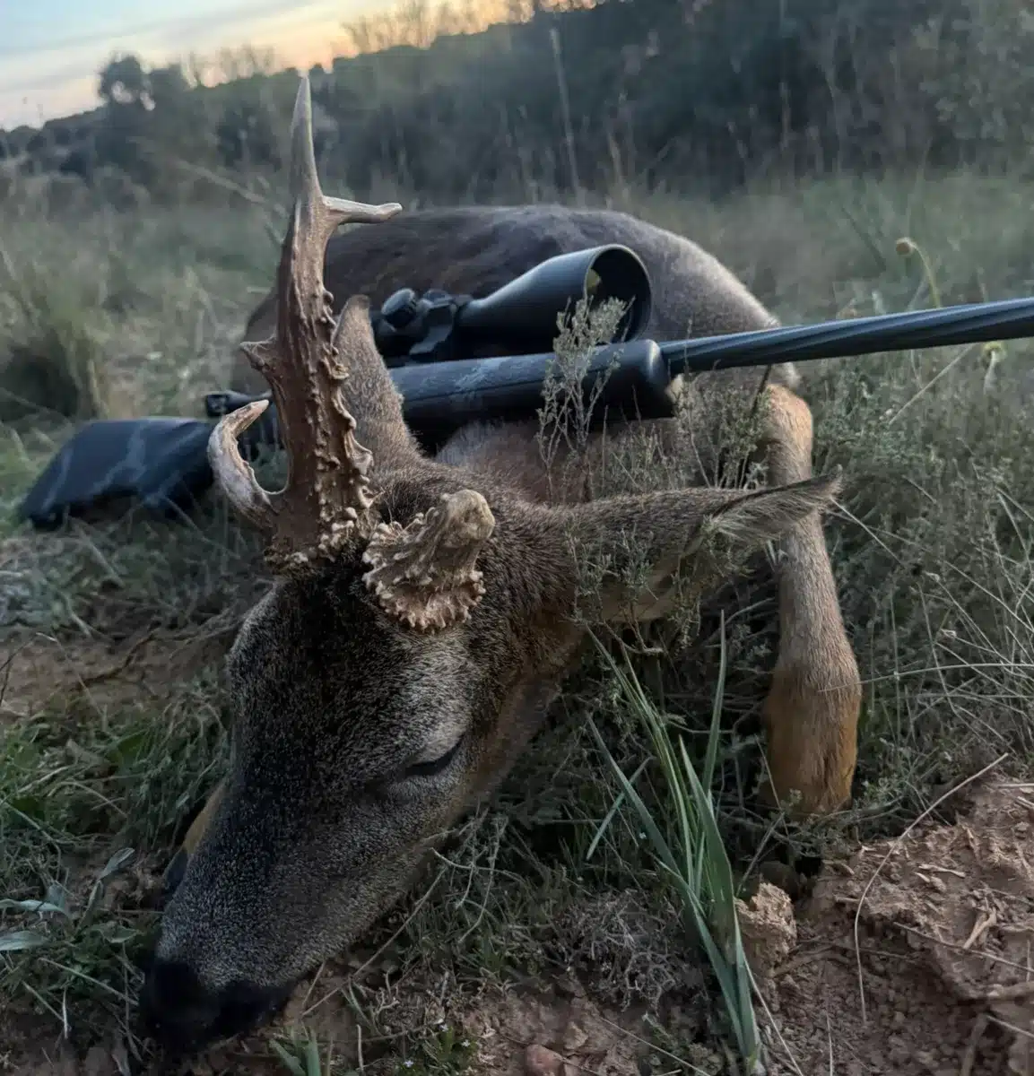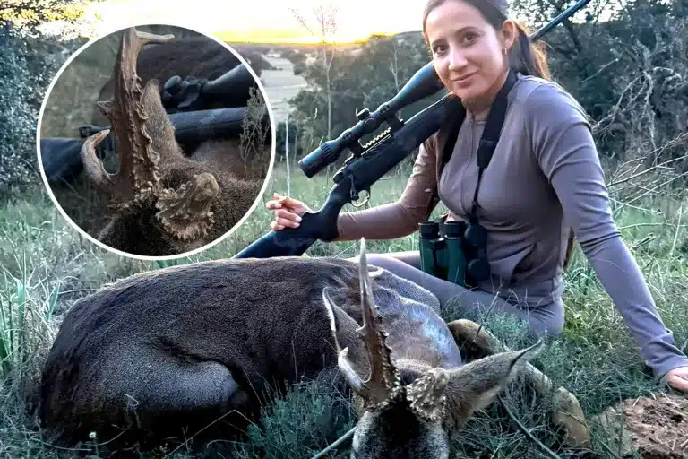 Cinco minutos más tarde, a lo lejos, apareció una silueta. Era una hembra acompañada, aparentemente, de un pequeño corzo. La escena obligó a reaccionar rápido. Intentaron acercarse, pero los animales detectaron su presencia y comenzaron a moverse hacia lo espeso. Fue entonces cuando Claudia intuyó que algo no encajaba. «Un vistazo rápido con los prismáticos y me pareció verle una sola cuerna», explica a Jara y Sedal. La confirmación llegó casi al instante. «Miré a Fran y mientras metía una bala me dijo ‘si y parece raro’».