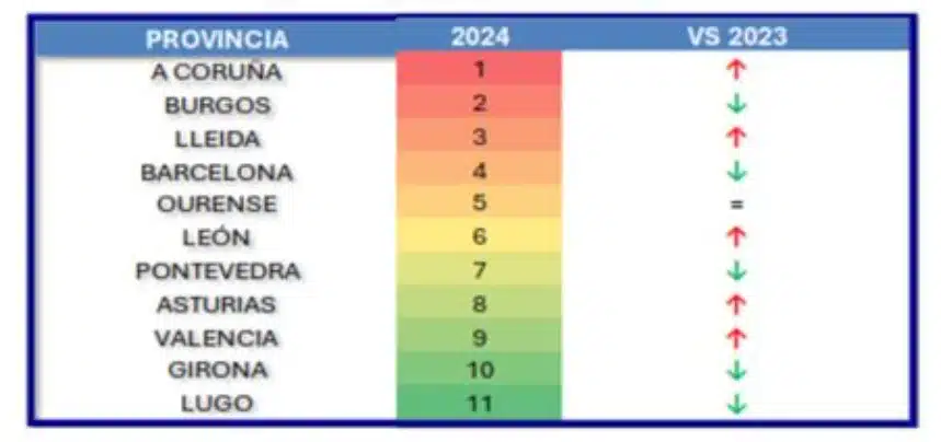 Castilla y León, Galicia y Cataluña concentran más de la mitad de los siniestros con animales en todo el país. Esta distribución se ha mantenido estable en los últimos años, aunque hay matices a nivel provincial. A Coruña, Burgos y Lleida son las provincias con mayor siniestralidad, si bien Burgos ha experimentado un descenso, mientras que A Coruña y Lleida han aumentado.