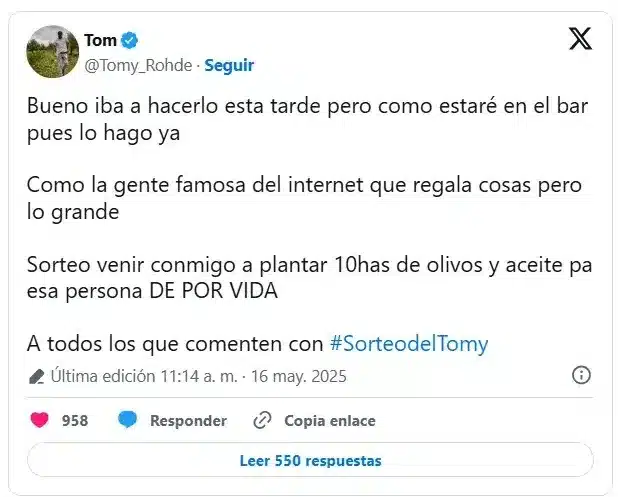 El sorteo no es un simple regalo. La condición para hacerse con el premio es acompañar a Tomy a plantar diez hectáreas de olivos. «Como la gente famosa del internet, que regala cosas pero lo grande. Sorteo venir conmigo a plantar 10 hectáreas de olivos y aceite para esa persona de por vida», explicaba el agricultor, dejando claro que no se trata solo de recibir, sino de comprometerse con el trabajo en el campo.