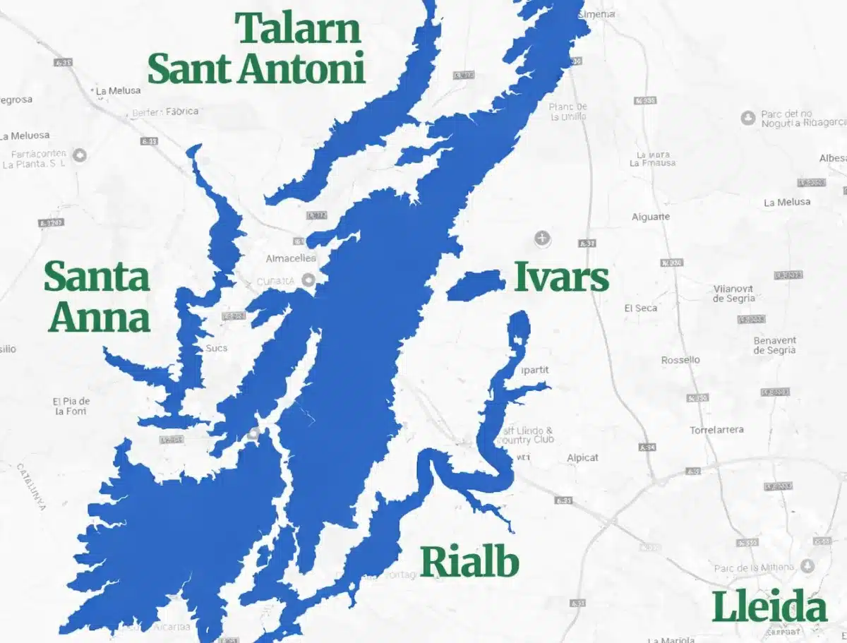 El gran ‘mar subterráneo’ de Lleida en el centro comparado con los embalses que lo rodean.