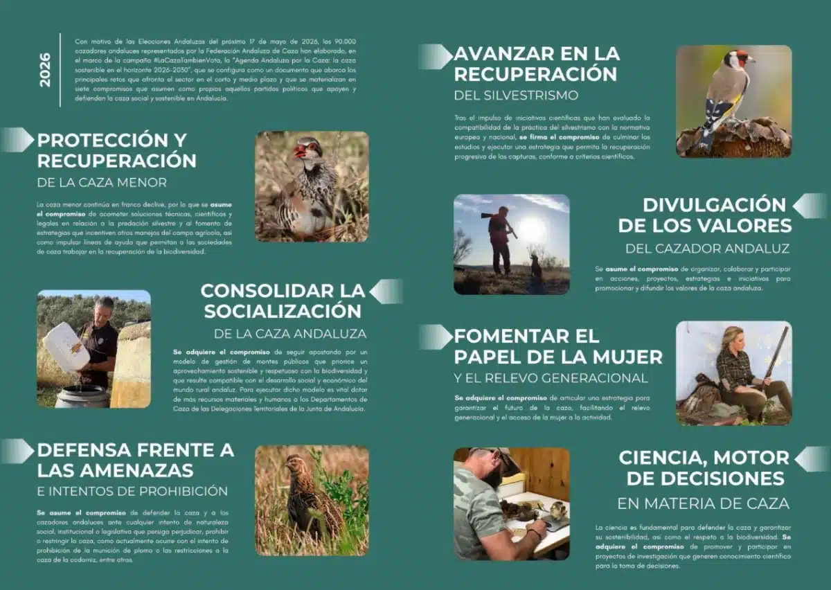 La denominada Agenda Andaluza por la Caza recoge una hoja de ruta con las principales reivindicaciones del sector para los próximos cuatro años. Elaborada por la propia Federación, se plantea como una herramienta política que cualquier partido podría incorporar a su programa si respalda la caza sostenible.