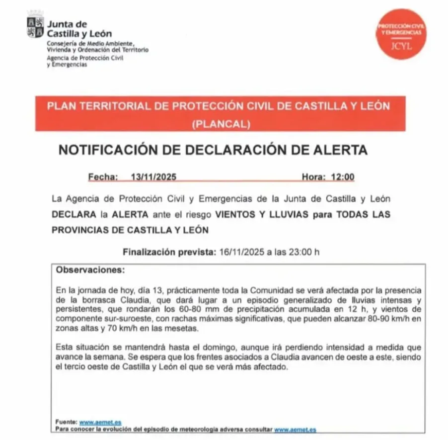 El aviso lanzado este jueves por la Agencia de Protección Civil y Emergencias afecta a todas las provincias de Castilla y León. La llegada de la borrasca Claudia, que ya se ha dejado sentir con fuerza en las primeras horas de la jornada, obligó a activar la alerta por vientos y lluvias hasta el domingo a las 23:00 horas, un escenario que puede complicar la actividad al aire libre durante todo el fin de semana.