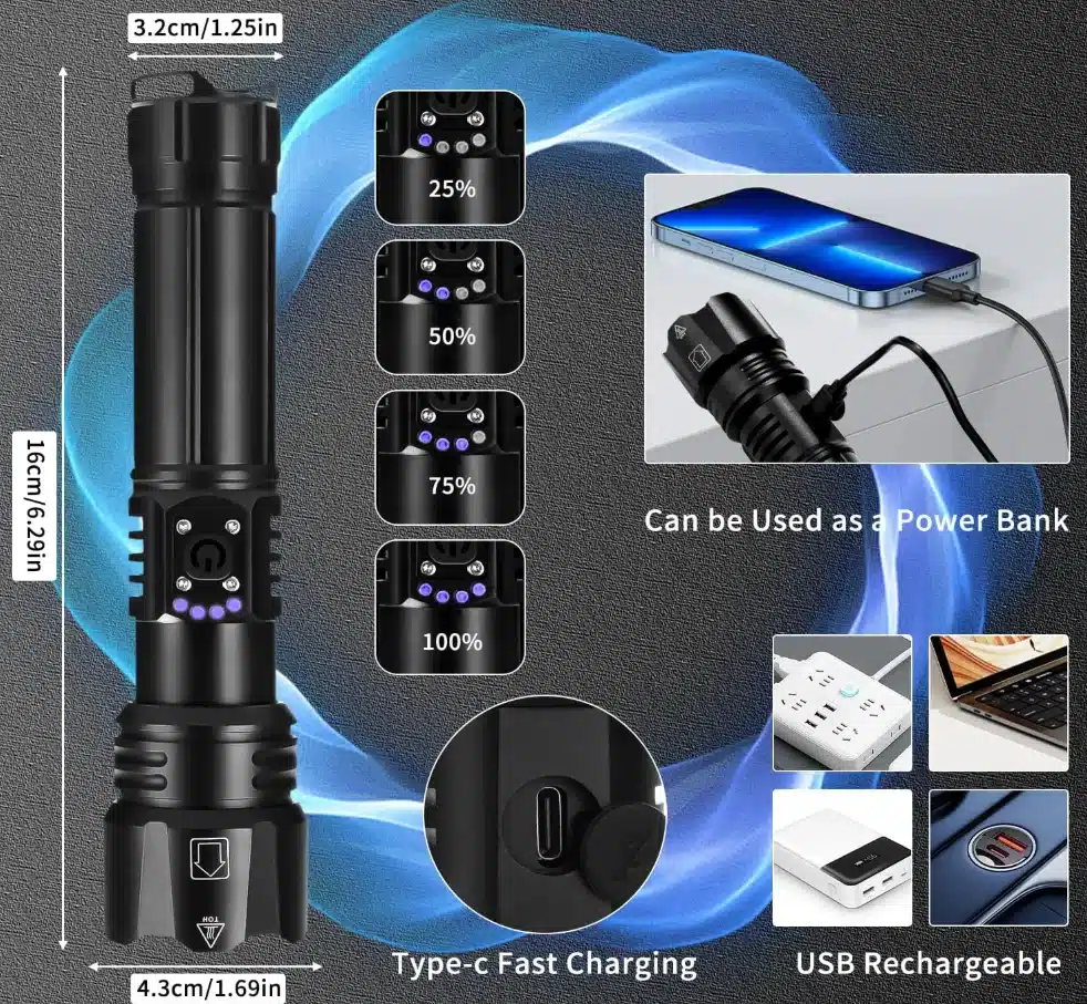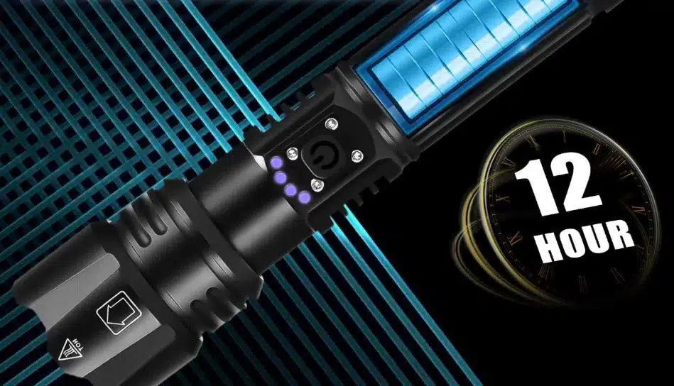 Otro de los puntos fuertes de esta linterna es su batería recargable de larga duración, que ofrece hasta 12 horas de autonomía en modo medio. El dispositivo incluye una interfaz USB y pantalla LED que muestra el nivel exacto de carga, lo que facilita su uso tanto en interiores como al aire libre.