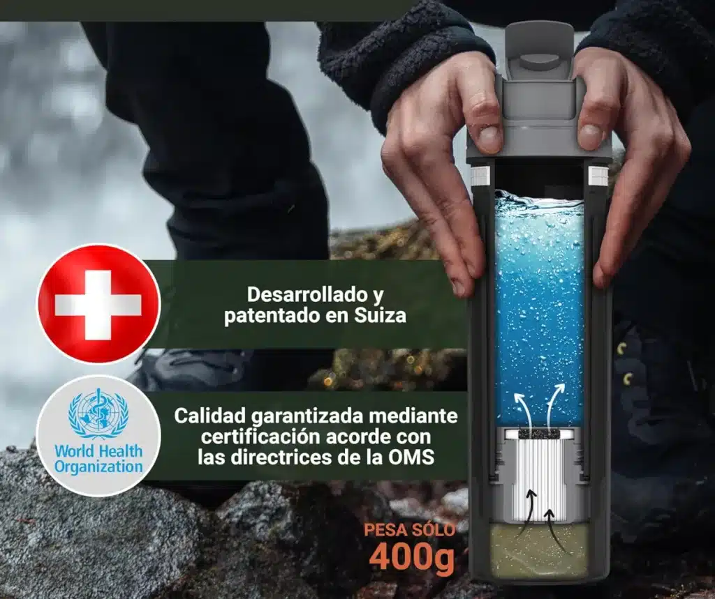 Esta innovadora botella ha revolucionado el concepto de filtrado portátil. Con una capacidad de 650 ml y una tecnología que elimina el 99,99% de las bacterias, virus, protozoos y partículas nocivas del agua, permite beber directamente de cualquier fuente, arroyo, río o incluso charca. Está equipada con una membrana de fibra hueca, un filtro de carbón activo y un sistema de autoprensado que evita el uso de componentes externos.