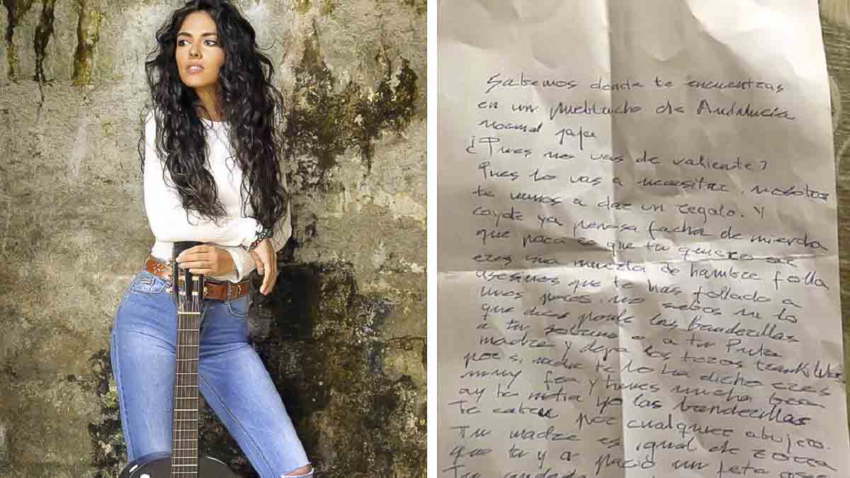 En la misiva, que la propia cantante publicó en sus redes sociales, se pueden leer –entre múltiples faltas de ortografía– amenazas como «sabemos dónde te encuentras, en un pueblucho de Andalucía, normal, ¿pues no vas de valiente? Lo vas a necesitar» o «Nosotros te vamos a enviar un regalo. Y cállate ya penosa facha de mierda».
