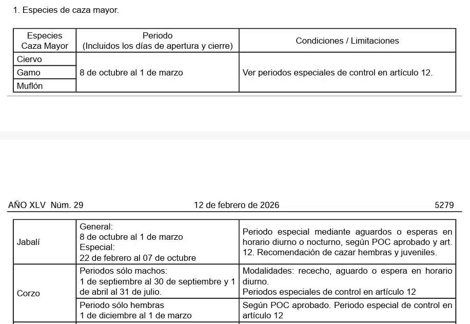 La misma ampliación afecta al jabalí en su periodo general, que también se extiende hasta el 1 de marzo en lugar de finalizar el 21 de febrero. Se mantiene, además, el periodo especial ya contemplado entre el 22 de febrero y el 7 de octubre.