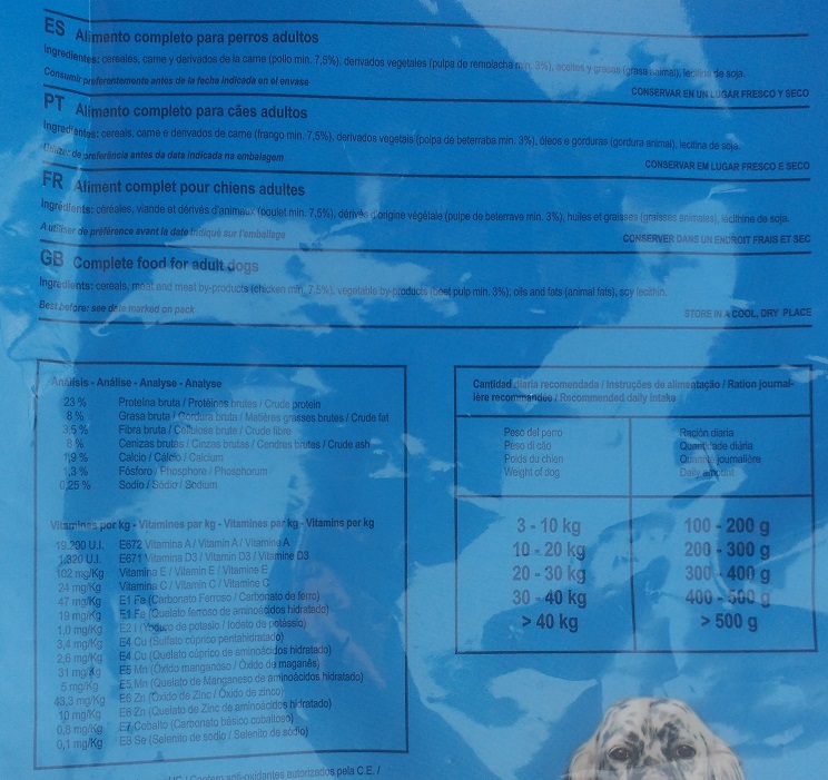 El primer ingrediente es un producto innecesario para los perros, y tras él viene la carne que es lo que nos interesa. Pero ojo, no todo es carne, también aparecen derivados (huesos, picos, patas…) y eso resta calidad a la proteína. El nivel de proteína bruta se sitúa en la media necesaria aunque la procedencia de ésta no sea la ideal. El pienso tiene una relación calidad- precio ajustada y acorde.
