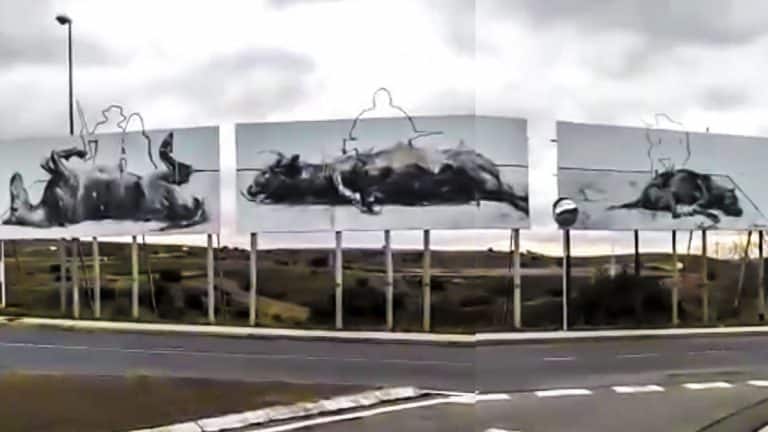 Tres carteles de tres siluetas de cazadores sobre un perro, un toro y un caballo muertos a sus pies criminalizan al sector cinegético a la entrada de Segovia capital. Las imágenes, enviadas a la redacción de Jara y Sedal por uno de nuestros seguidores, han sido filmadas en una rotonda cercana al Centro Comercial Luz de Castilla de Segovia.