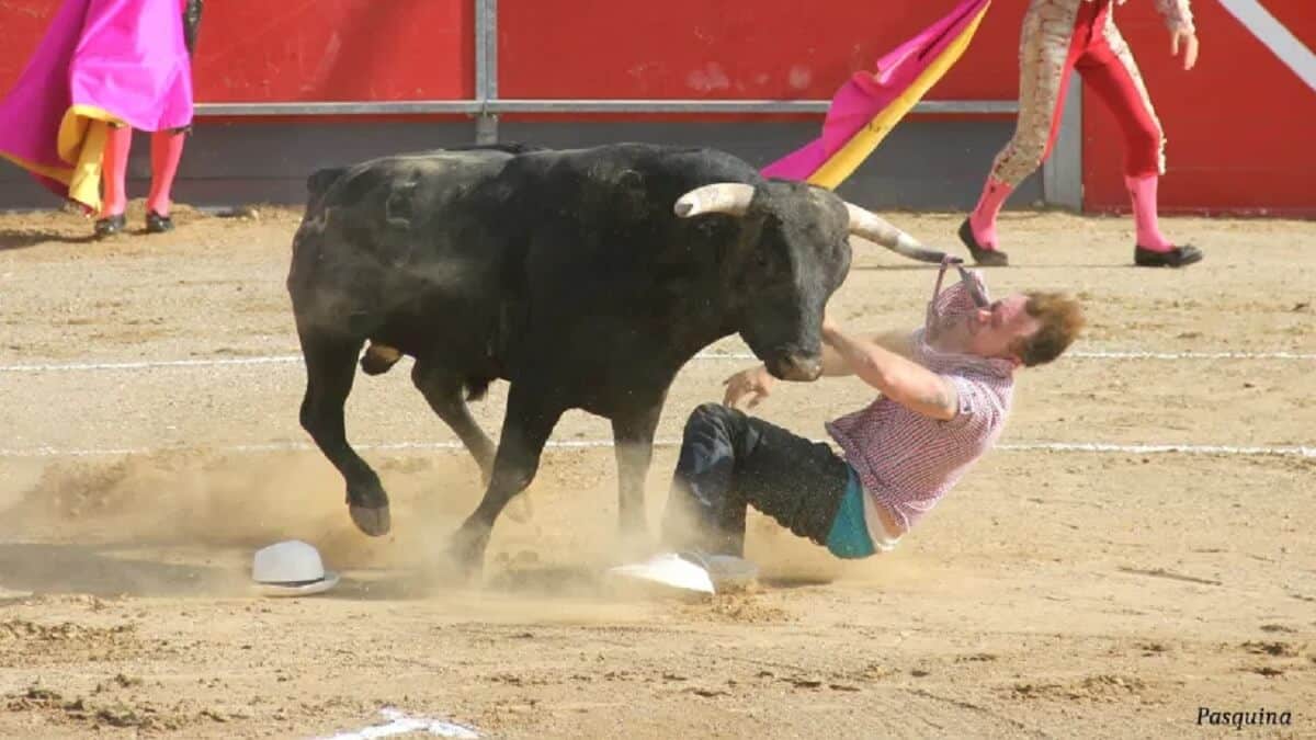 En él se muestra cómo un animalista se tiró al ruedo de la plaza de toros francesa de Carcassone para comprobar si un novillo de la ganadería de Miura era inofensivo… y éste acabó corneándolo. Solamente la rápida y efectiva acción de los toreros, que recogen de forma presta al animalista, evita que lo que terminó como una anécdota fuese una tragedia.