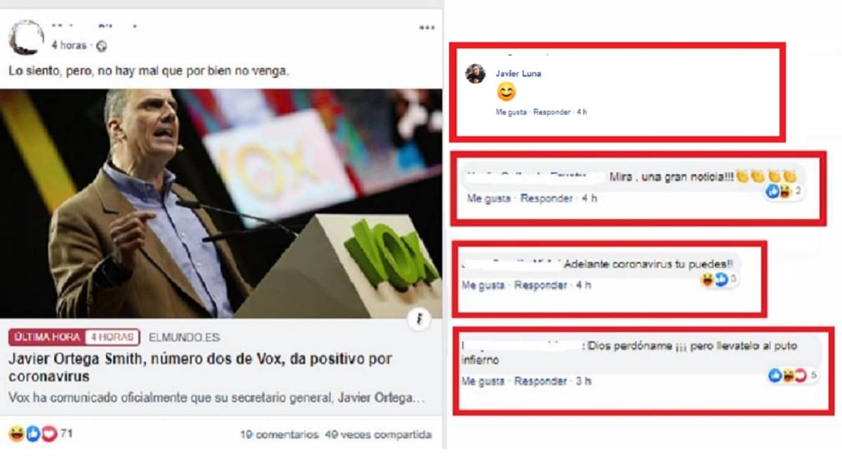 Un animalista, administrador de una página ‘antiespecista’ ha publicado la noticia en la que se confirma oficialmente que el número dos de VOX ha dado positivo al virus que ya ha causado en España la muerte de 35 personas junto a la siguiente frase: «Lo siento, pero no hay mal que por bien no venga». Entre las reacciones a los emoticonos de ‘Me encanta’ o ‘Me divierte’ se encuentra la de Javier Luna, candidato de PACMA al Congreso de los Diputados por la provincia de Córdoba y presidente de la asociación para la protección animal ‘Galgos del sur’. Se trata de uno de los anticaza más mediáticos de nuestro país, el cual era noticia hace unos días por asegurar que el informe del Seprona sobre el abandono de perros de caza abandonados de 2019 era falso. Un informe que desmontaba, un año más, la mentira de los 50.000 galgos abandonados.