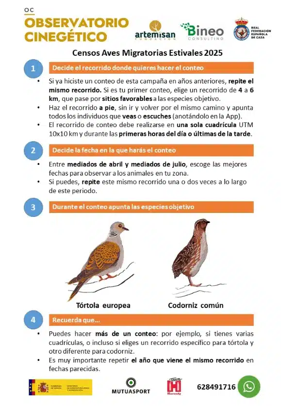 En concreto, la campaña de aves migratorias estivales se centra en la tórtola y la codorniz y se desarrollará hasta mediados de julio. Los colaboradores del Observatorio Cinegético deberán hacer conteos en un recorrido de 4 a 6 kilómetros a pie, que pase por sitios favorables a las especies objetivos.