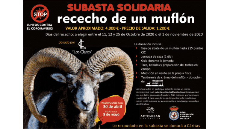 La Fundación Artemisan ha lanzado una nueva subasta solidaria, en este caso un rececho de muflón en Ciudad Real, donado por la empresa ‘Los Claros’, cuya recaudación irá destinada a la campaña de recogida de fondos lanzada con la Federación Española de Caza a beneficio del proyecto ‘Cáritas ante el Coronavirus’.