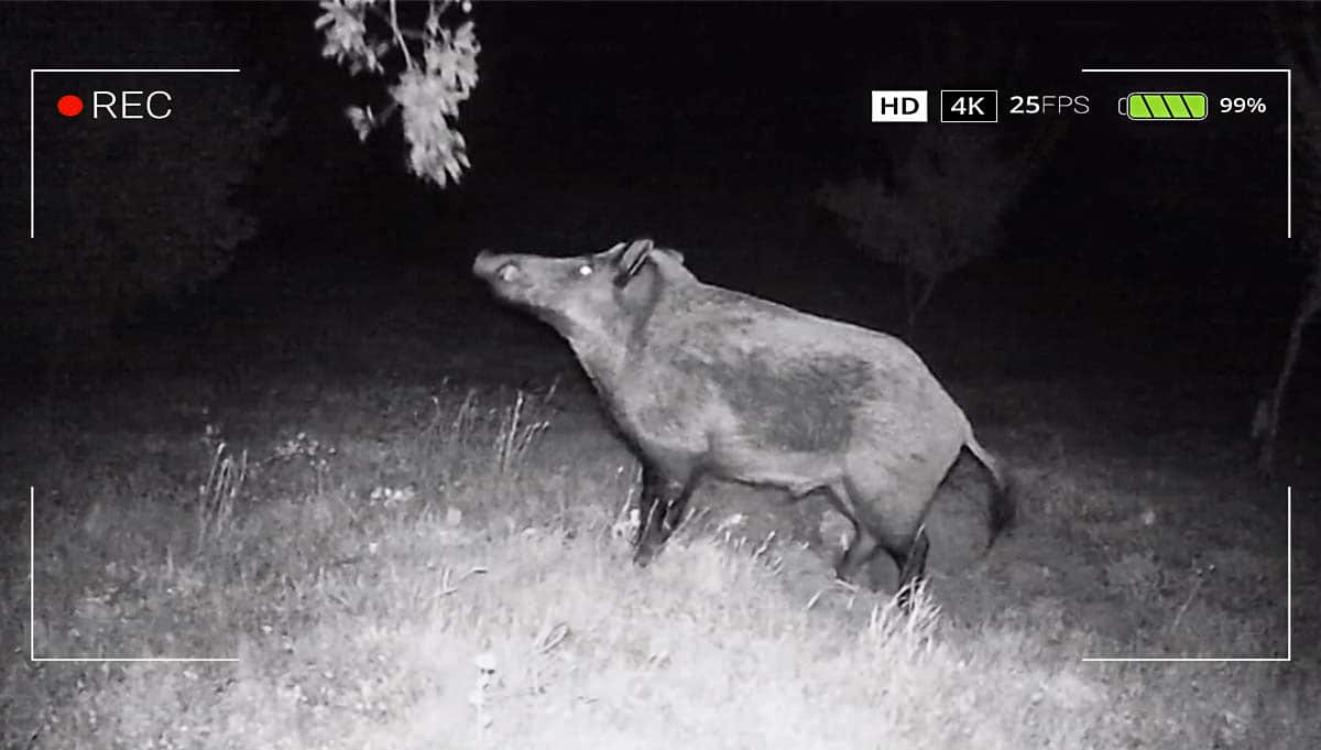 Pillado in fraganti por una cámara trampa, un gran jabalí macho se las ingenia para comerse las ciruelas de un árbol. Como ya ha acabado con los frutos caídos en el suelo, el animal se levanta sobre sus patas traseras y muerde las ramas, aprovechando la inercia de la caída para arrancarlas.