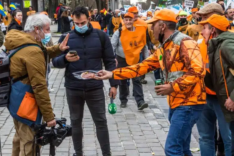 En la fotografía se aprecia a varios cazadores ofreciendo un plato de jamón a los reporteros de La Sexta tras una conexión en directo. Un gesto sencillo, pero cargado de significado: el de una protesta masiva que no solo fue pacífica, sino también hospitalaria incluso para quienes de manera reiterada solo se fijan en la caza para atacarla o estigmatizarla.