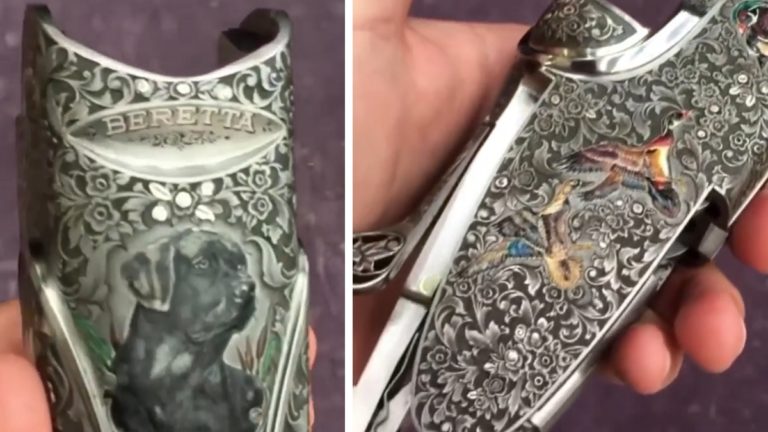 La siguiente filmación muestra la báscula de una escopeta superpuesta de lujo de la factoría Beretta que cuenta en sus grabados con motivos relacionados con la caza de aves acuáticas. En la parte inferior se puede apreciar la cabeza de un labrador retriever. En las pletinas, varias acuáticas a color y en pleno vuelo ponen la guinda a un trabajo que ha dejado sin palabras a cazadores y tiradores.