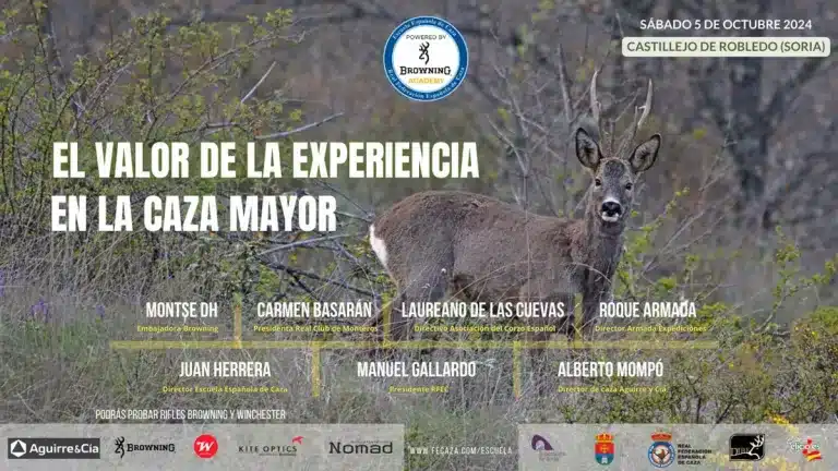 En este primer curso titulado «El valor de la experiencia en la caza mayor» se tratará la esencia de la caza mayor en todas sus modalidades, contado con la participación de expertos como Manuel Gallardo (presidente de la RFEC), Montse DH (embajadora de Browning en España), Carmen Basarán (presidenta del Real Club de Monteros), Laureano de las Cuevas (directivo de la Asociación del Corzo Español), Roque Armada (director de Armada Expediciones), Juan Herrera (Director de la Escuela Española de Caza) o Alberto Mompó (director de caza de Aguirre y Cía, distribuidor en España de Browning, Winchester, Kite Optics y monturas Nomad).