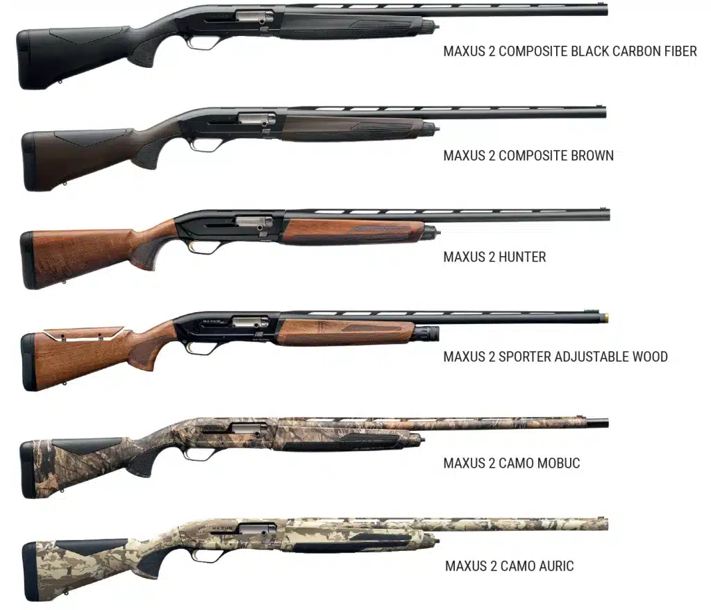 La gama Maxus 2 se presenta en diferentes acabados que van desde el camuflaje hasta versiones en composite o madera. Entre ellos destacan la Maxus 2 Composite Black Carbon Fiber, la Maxus 2 Composite Brown, la Maxus 2 Hunter, la Maxus 2, los modelos Camo Mobuc y Camo Auric, sin olvidar la versión Sporter Adjustable Wood, pensada para tiradores de recorridos de caza que buscan culatas regulables.