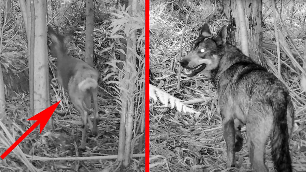 Una cámara de fototrampeo ha conseguido captar el momento exacto en el que un lobo sigue el rastro de un corzo que ha pasado por el mismo lugar nueve minutos antes. En concreto, el pequeño cérvido atraviesa el lugar en el que está colocada la cámara a las 8:04 horas de la mañana, mientras que el cánido pasa por allí olisqueando el rastro que ha dejado el corzo nueve minutos después, a las 8:13 horas.