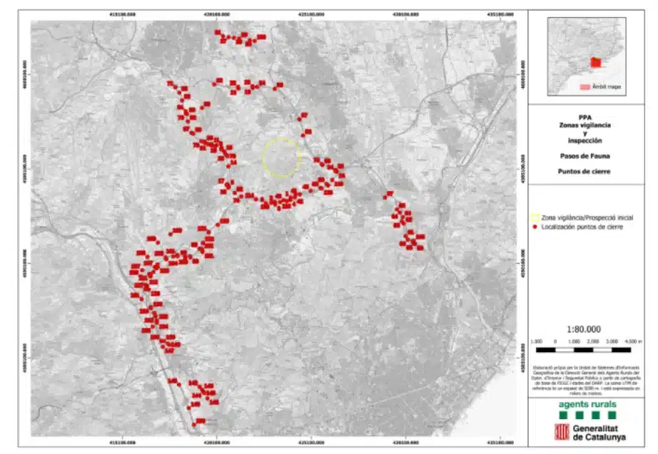 Dentro de este plan, se han identificado 180 puntos de paso considerados de riesgo, donde se han instalado barreras físicas o pasos canadienses, con el objetivo de reforzar el aislamiento y frenar desplazamientos no controlados de fauna silvestre hacia zonas sensibles.