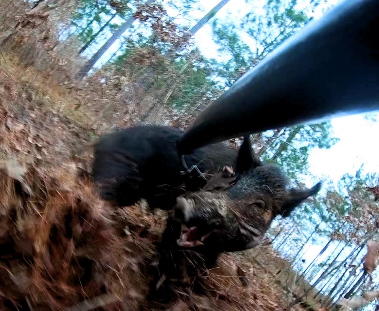 El suido se esconde en una zona espesa, donde los perros delatan su posición. El cazador llega hasta el lugar e intenta alcanzar con su lanza al jabalí, que sin embargo escapa. Sin embargo, el protagonista del vídeo no cesa en su empeño: se dispone una vez más a buscar al animal hasta que finalmente en un claro y flanqueado por dos de sus perros, se para.
