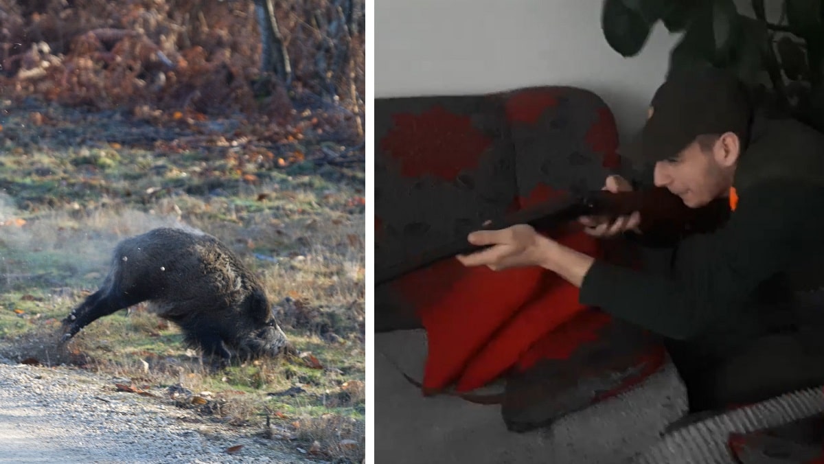 Es el caso de este chico que se ha colocado la indumentaria de caza para grabar un vídeo en el que aparece en el salón de su casa apuntado hacia la televisión. En esta se reproduce un documental de caza en el que el cochino que aparece en escena cae de un certero disparo a la vez que el chico aprieta el gatillo.