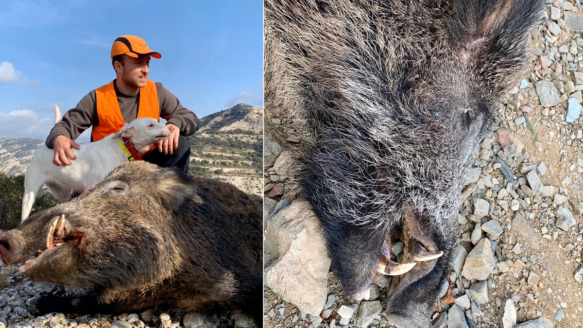 Este joven catalán hizo doblete de jabalíes en su coto social de Tarragona el pasado fin de semana. Cuando se acercó a uno de los ejemplares quedó sorprendido por sus tremendos colmillos.