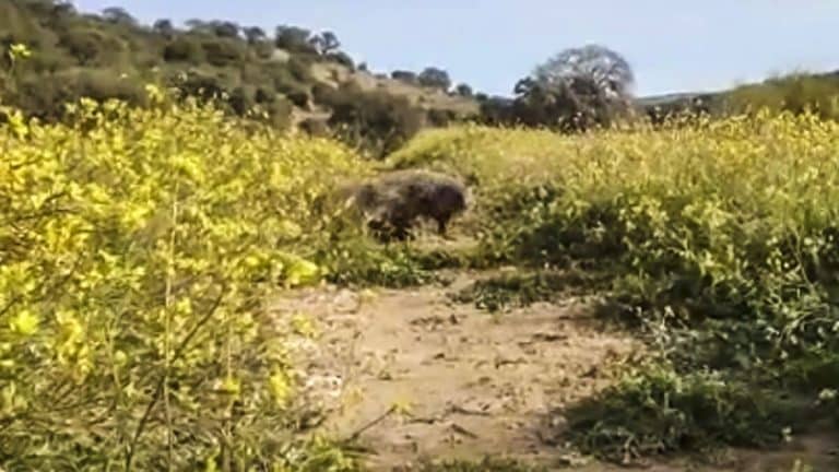 En cuestión de segundos se ve al pequeño mamífero aparecer entre la frondosa hierba donde se encuentra el hombre. El animal muestra curiosidad por el sonido y se va acercando hasta que descubre que es un ser humano el que se encuentra allí, por lo que decide huir. Al fondo de la imagen se puede observar cómo otro meloncillo aparece en escena.