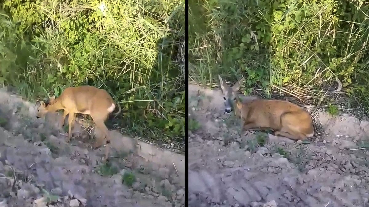 El joven cazador Óscar Álvaro Gálvez, natural de la localidad alcarreña de Trillo, logró grabar ayer por la mañana una corza adulta con un extraño comportamiento. El animal no podía caminar bien y Óscar se acercó para tratar de ayudarla.