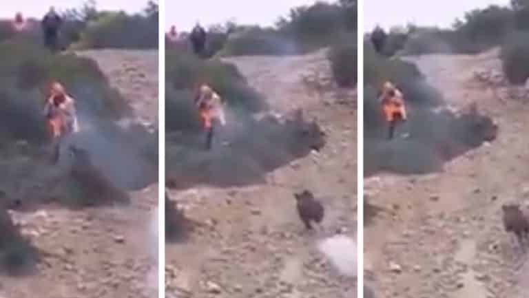 Tres hombres detienen hábilmente el ataque de un jabalí usando palos