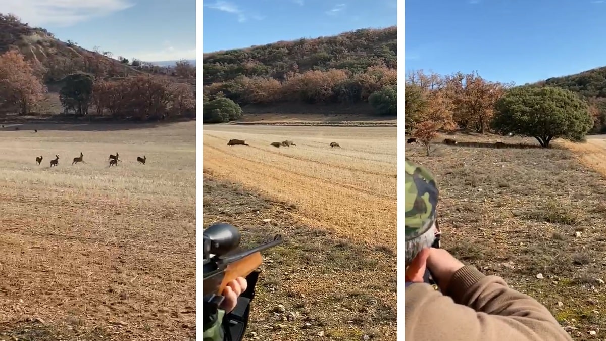 Aunque probablemente la noche anterior este cazador soñase con un lance muy parecido al que su compañero grabó en vídeo, seguro que el final de este no se parecía mucho. Hasta siete corzos y cuatro jabalíes cruzan el rastrojo que el hombre tiene por delante, suficientemente ancho como para dejar cumplir a la piara, apuntar y disparar con tranquilidad.