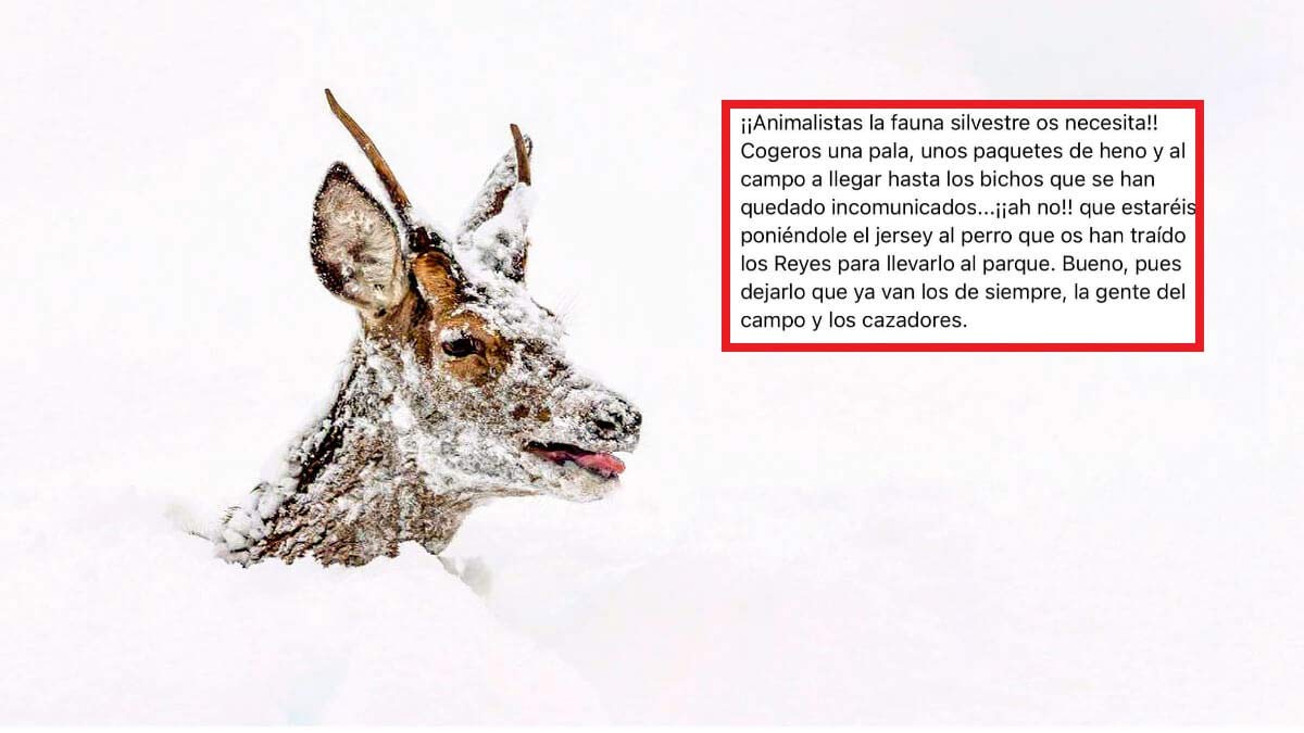 Ahora, el mensaje que ha sido compartido en más de 10.000 ocasiones junto a la fotografía es el siguiente: «¡Animalistas, la fauna silvestre os necesita! Cogeos una pala, unos paquetes de heno y al campo a llegar hasta los bichos que se han quedado incomunicados… iAh no! Que estaréis poniéndole el jersey al perro que os han traído los Reyes para llevarlo al parque. Bueno, pues dejarlo que ya van los de siempre, la gente del campo y los cazadores».