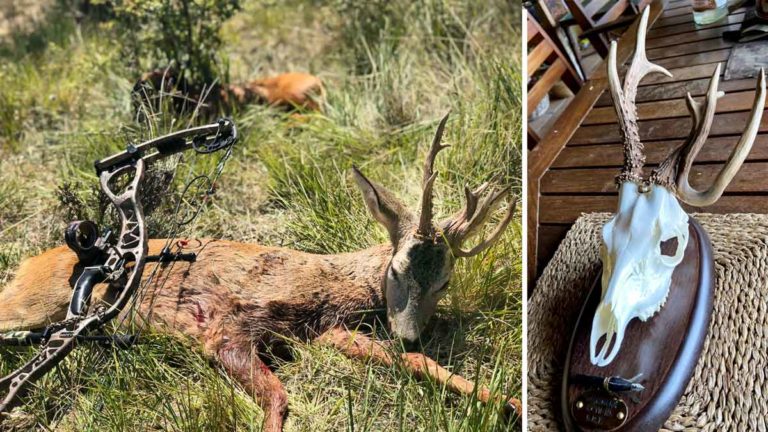 El pequeño pero raro cérvido se les iba acercando cada vez más: «En un momento dado, se tapó en el monte, pero nos apareció segundos más tarde a nuestro lado y, en cuanto nos vio, se paró de frente. Era el momento perfecto para soltar la cuerda y disparar la flecha», recuerda Gonzalo. «La flecha fue justo al mismo pecho y sólo le dio tiempo a correr 50 metros al corzo antes de caer fulminado», exclama el joven.