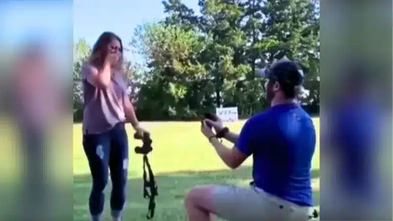 De este modo, en su base aparece un texto que, gracias al aumento de esos binoculares a través de los que estaba mirando la escena atentamente, puede ver con claridad: «¿Quieres casarte conmigo?». Tanta fue la sorpresa que tiró los prismáticos al suelo y tan solo podía mirar emocionada a su futuro marido.