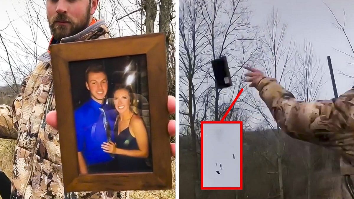 El hombre, que aparece vestido con ropa de caza y sosteniendo una escopeta con su mano derecha, enseña a la cámara la foto en la que aparece junto a su pareja. Poco después lanza esta última al aire, apunta y… dispara.