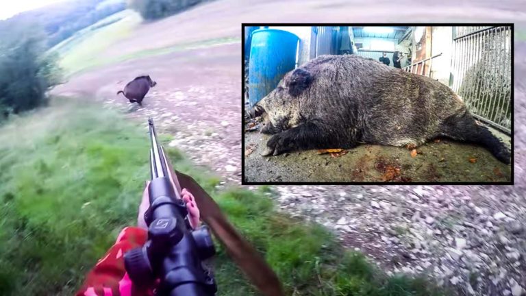 El vídeo que te mostramos a continuación muestra un frenético lance protagonizado por un jabalí de 143 kilos y por una cazadora que maneja con plena habilidad el rifle, ya que el descomunal macareno atraviesa a toda velocidad un campo y ésta logra abatirlo.