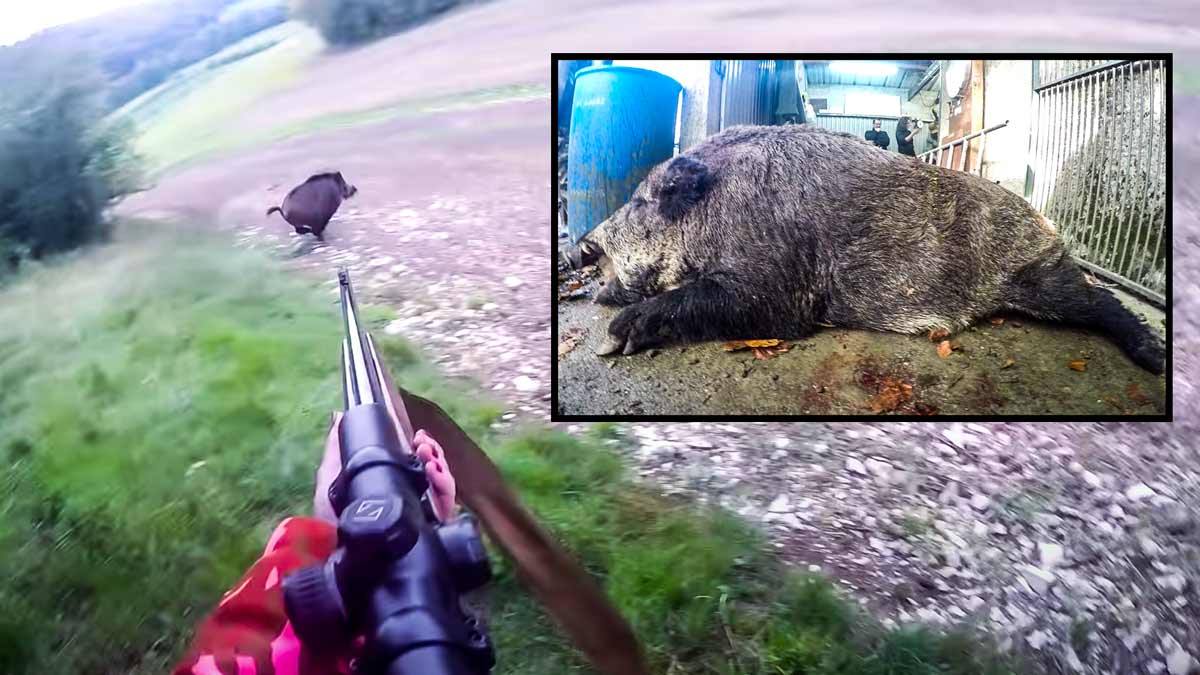 En los primeros segundos del lance, el jabalí puede dar la impresión de salir ‘victorioso’ del puesto de caza, pero no: la mujer está apuntando en todo momento y esperando el segundo perfecto para abatirlo, algo que logra de dos disparos.