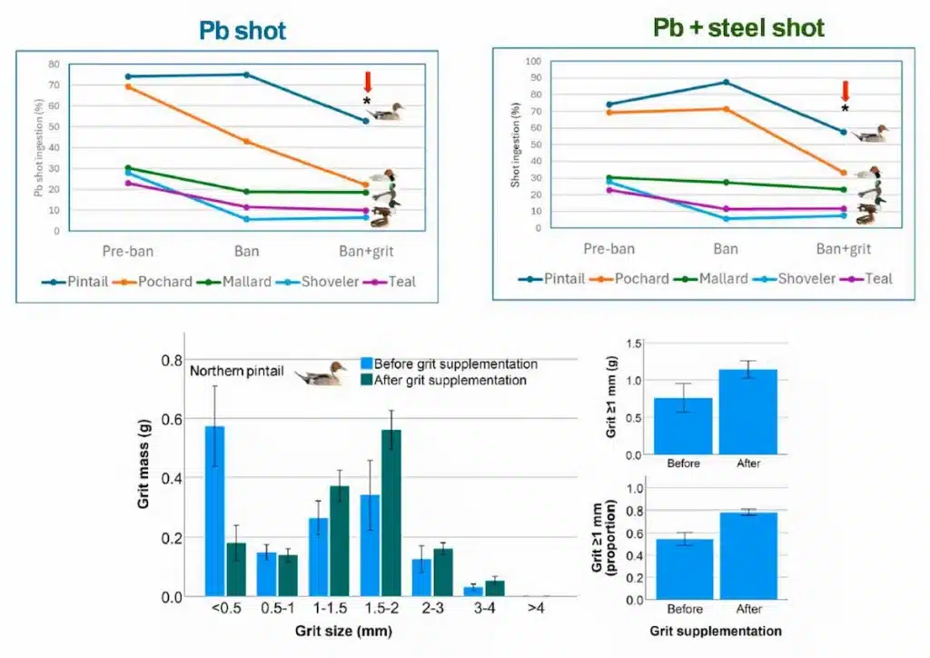El estudio comparó tres etapas clave: la situación antes de la prohibición del plomo (1991–1996), después de la prohibición pero sin gravilla (2007–2009) y después de la prohibición con suplementación de gravilla (2009–2015). Los resultados fueron contundentes. La ingestión de perdigones de plomo descendió entre un 29,1 % y un 77,0 % tras la entrada en vigor de la normativa, y esta reducción se mantuvo e incluso mejoró con la introducción de gravilla.