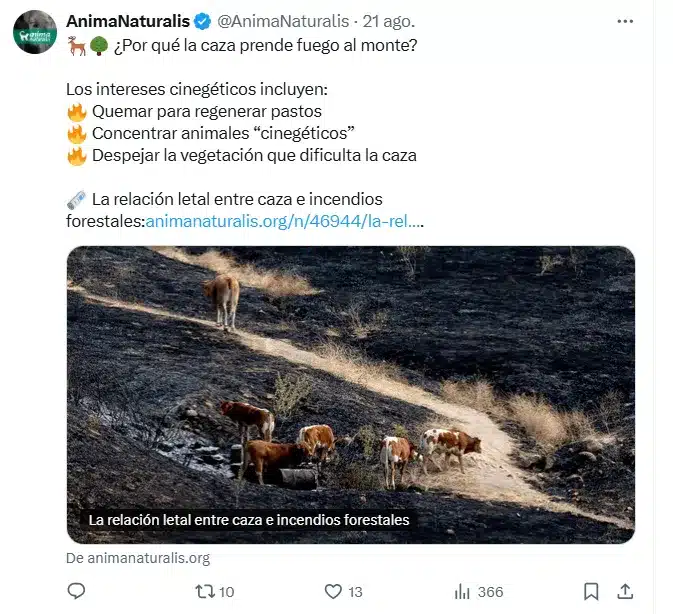 A pesar de la evidencia de que los cazadores han estado jugándose la vida para salvar sus montes, algunos colectivos animalistas han aprovechado los incendios para lanzar ataques. AnimaNaturalis llegó a difundir en redes sociales que «la caza prende fuego al monte» y enumeró supuestos intereses cinegéticos, como la regeneración de pastos o la concentración de animales.