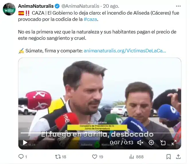 Estos mensajes se apoyaron en la confusión inicial generada por el incendio de Aliseda, donde se insinuó un vínculo con la actividad cinegética. Sin embargo, el propio consejero de Presidencia de la Junta de Extremadura, Abel Bautista, aclaró que nada tenía que ver con la caza y que la información había sido malinterpretada. Un desmentido oficial que, lejos de frenar la campaña animalista, quedó relegado en redes sociales frente a titulares acusatorios.