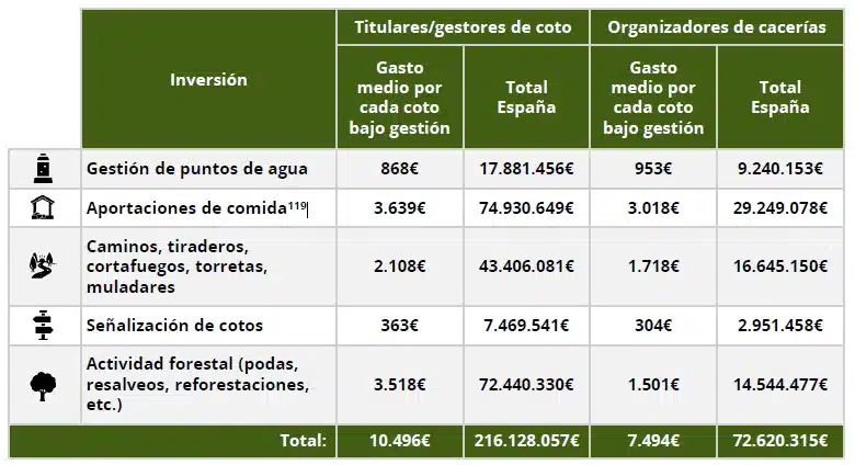 Según el reciente Estudio del impacto económico, social y ambiental de la actividad cinegética en España, presentado por la Fundación Artemisan, los cazadores realizan una importante labor ambiental en todo el territorio. Solo en lo relativo a la gestión de puntos de agua, se estima un gasto total de más de 27 millones de euros al año entre titulares de cotos y organizadores de cacerías.