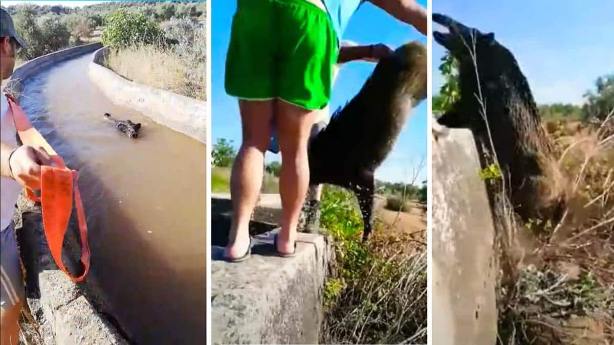 Rescatan a un gran jabalí de un canal y les ataca al salir