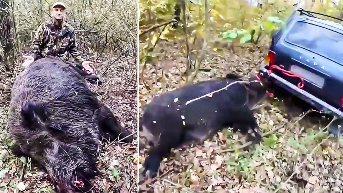 Varios cazadores rusos se disponen a cazar jabalíes en batida. Los perros consiguen dar con un gran cochino que carga contra uno de los hombres. Aunque este acierta, aún tiene que dispararle varias veces más para conseguir abatir al monstruo.