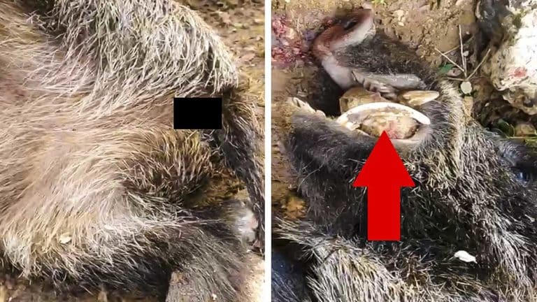 Al final de la grabación el hombre que muestra el cochino dice: ¡Mira lo que tiene aquí delante!», enseñando los enormes colmillos del animal tras haber mostrado que se trata de una hembra.