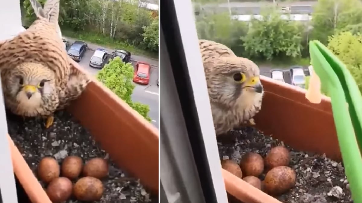 Los edificios altos con posaderas en las ventanas son un buen atractivo para aquellas personas a las que les gusten las amplias vistas… y para las aves que buscan protección. Es lo que le ha ocurrido a este cernícalo que ha decidido hacer el nido en la maceta de la ventana de esta vivienda.