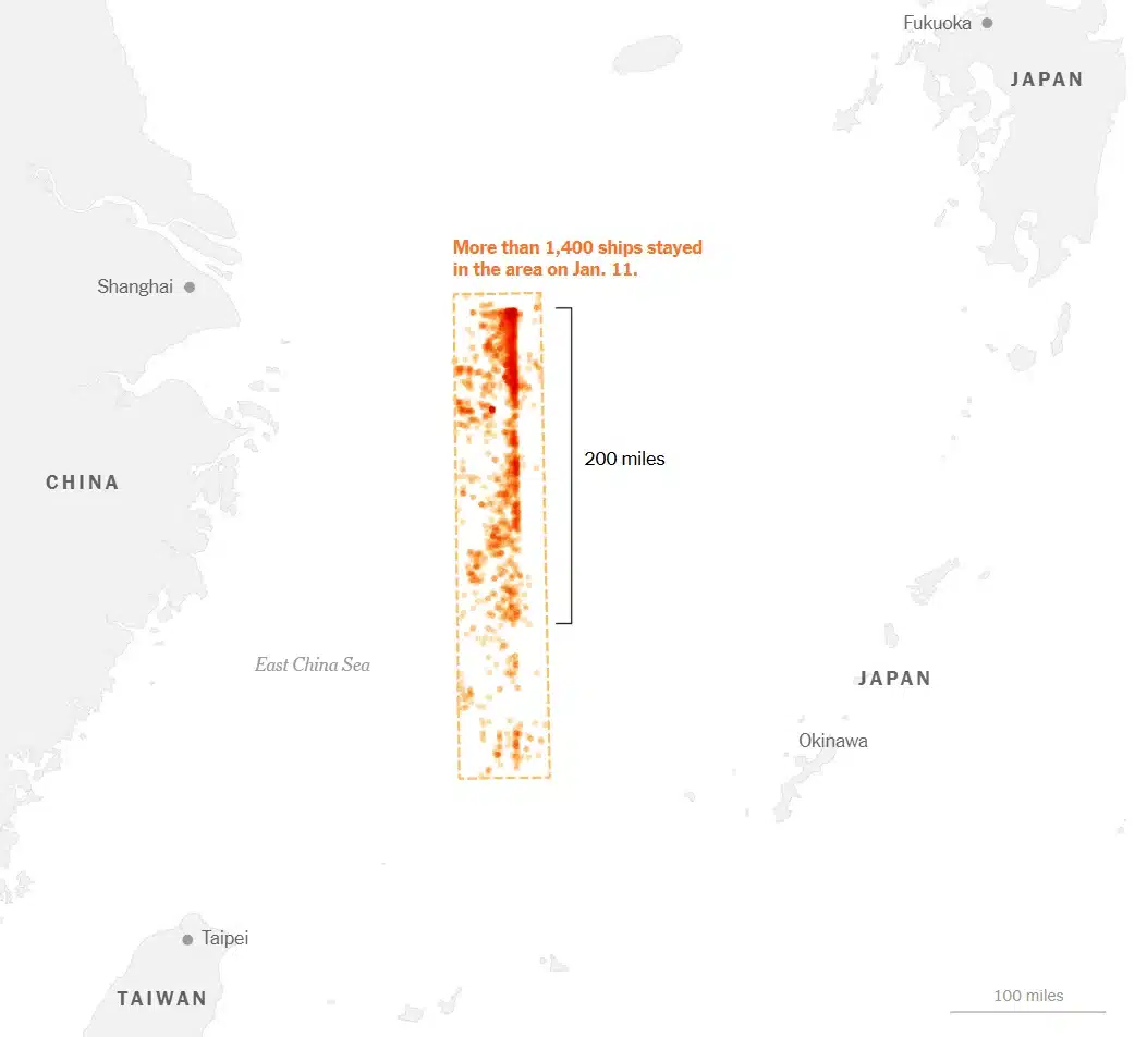 Más de 1.400 pesqueros formaban una barrera de 320 kilómetros el pasado 11 de enero. © The New York Times