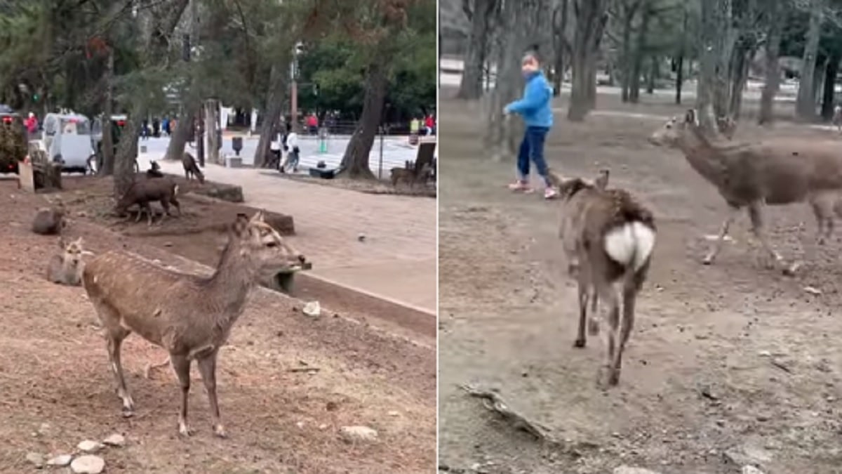 El vídeo que reproducimos a continuación muestra cómo una niña acaricia a una cierva salvaje y ésta la persigue hasta derribarla. Las imágenes han sido tomadas en el parque de la ciudad de Nara, en Japón, habitado por ciervos que viven en total libertad y en ocasiones interactúan con los humanos, algo en ocasiones peligroso como demuestra este hecho.