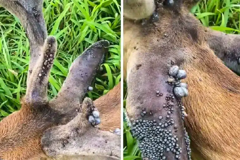 La imagen del animal atropellado permite observar con detalle el alcance del problema. Las garrapatas forman auténticos racimos oscuros, dejando claro que llevaban tiempo alimentándose del ciervo. Este nivel de parasitación puede provocar debilidad extrema, anemia y transmisión de enfermedades, reduciendo seriamente las posibilidades de supervivencia del animal incluso antes del accidente.