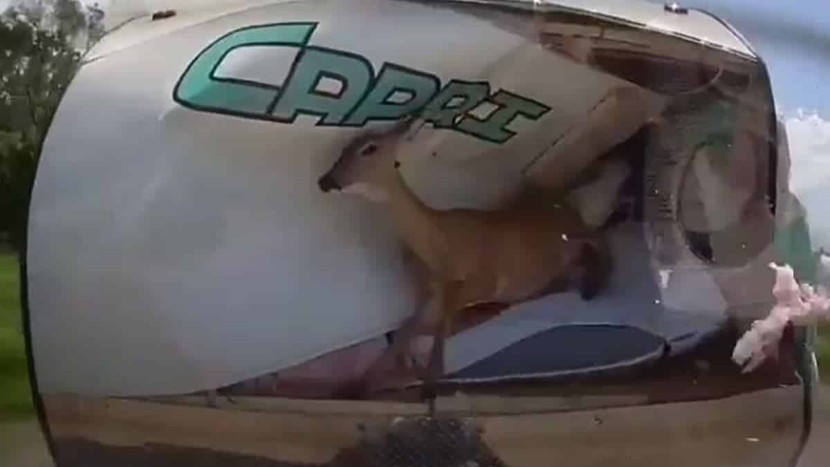 La sobrepoblación de animales silvestres en múltiples zonas del planeta provoca imágenes impactantes como la que te mostramos a continuación. En ella se ve cómo una cierva que se cruza en el camino de un vehículo se estampa contra la caravana que éste portaba en su parte trasera.