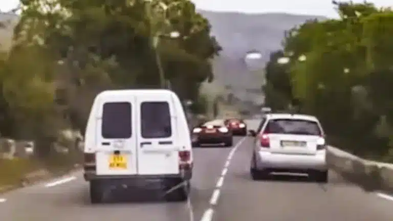 La escena comienza con la Citroën C15, una furgoneta que se ha convertido en todo un símbolo de resistencia y durabilidad, pegándose al coche deportivo en una carretera serpenteante. Con una narración llena de humor, la filmación nos muestra cómo el conductor de la C15 no solo sigue de cerca al deportivo, sino cómo trata de desafiarlo.