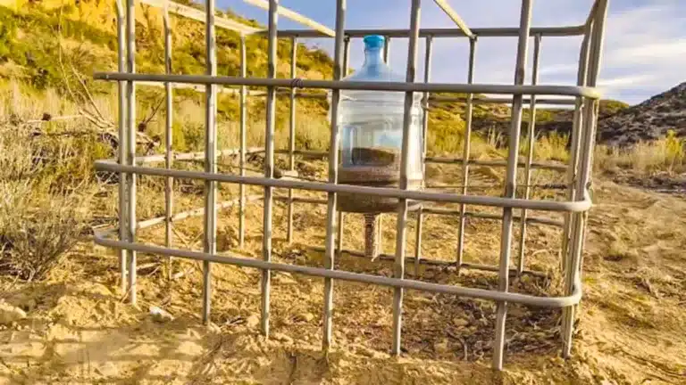 Como vemos en el siguiente vídeo, su instalación es un proceso bastante más simple de lo que podríamos imaginar. Arriba, colgada de la estructura de un depósito reciclada como protección ante animales como los jabalíes, se coloca la garrafa, a la que se le hace un pequeño agujero en su parte inferior. En él hay que encajar el resorte, por el que bajará el grano para que estén al alcance de los animales.